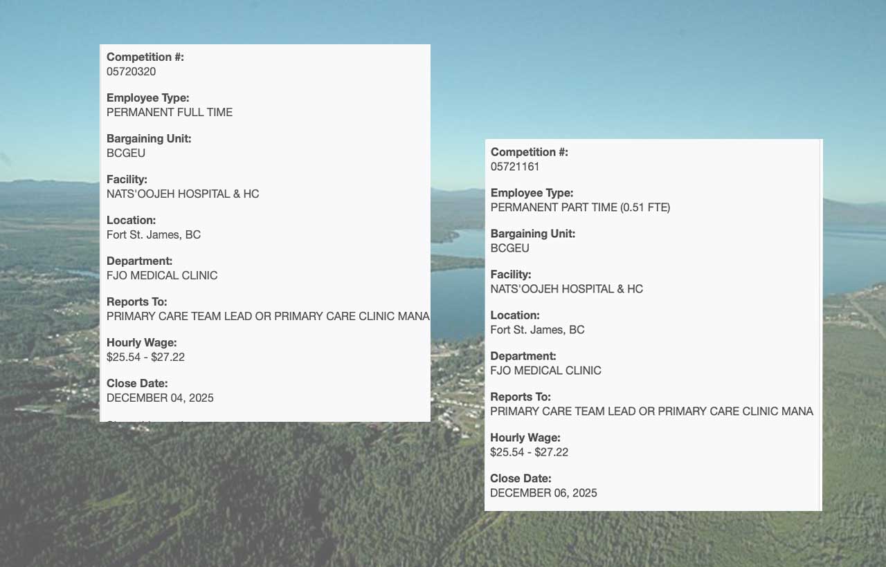 Northern Health is looking for two Primary Care Assistants to work at Nats’oojeh Hospital and Health Centre in Fort St. James. One Full-time and one Part-time.